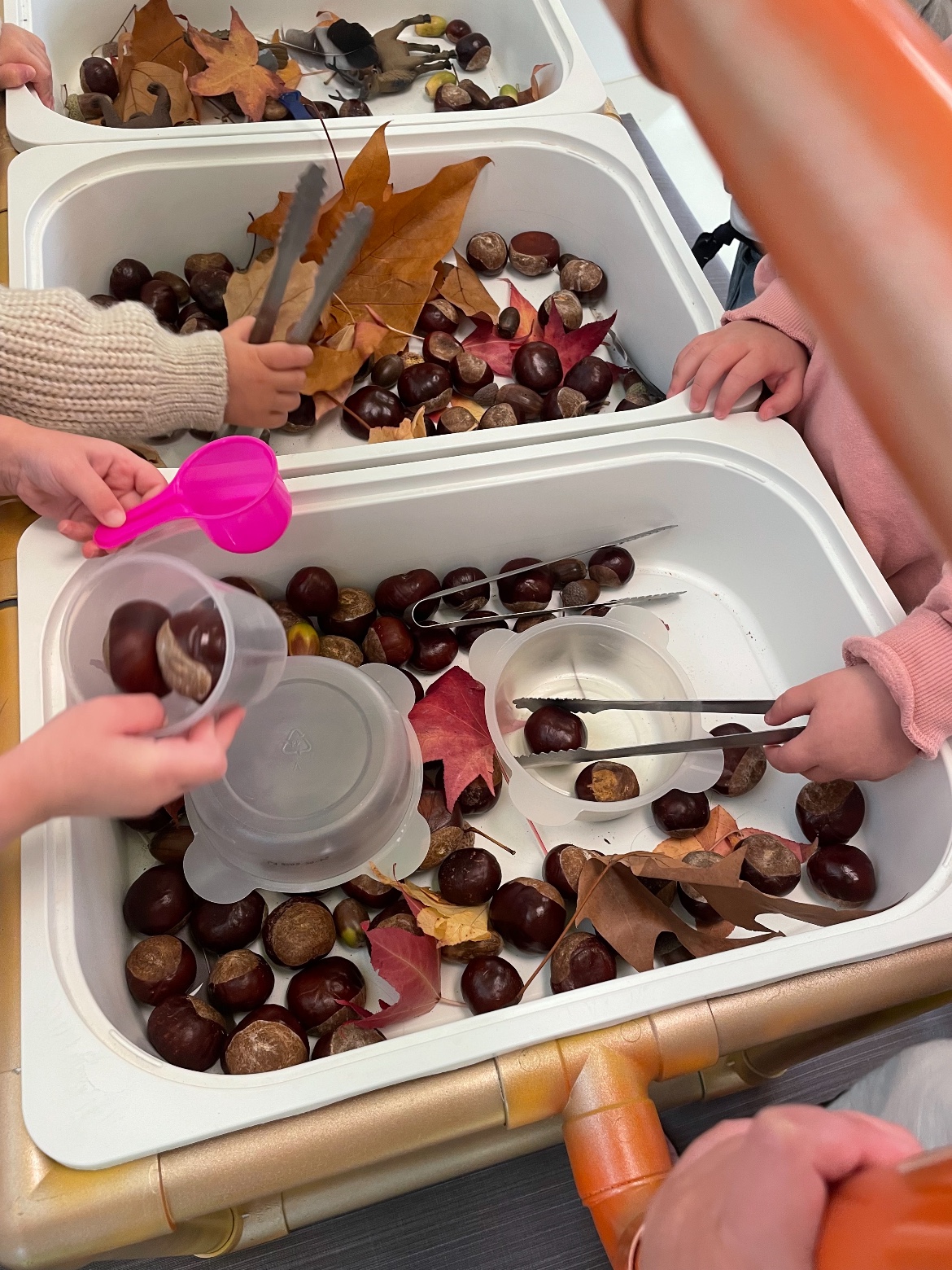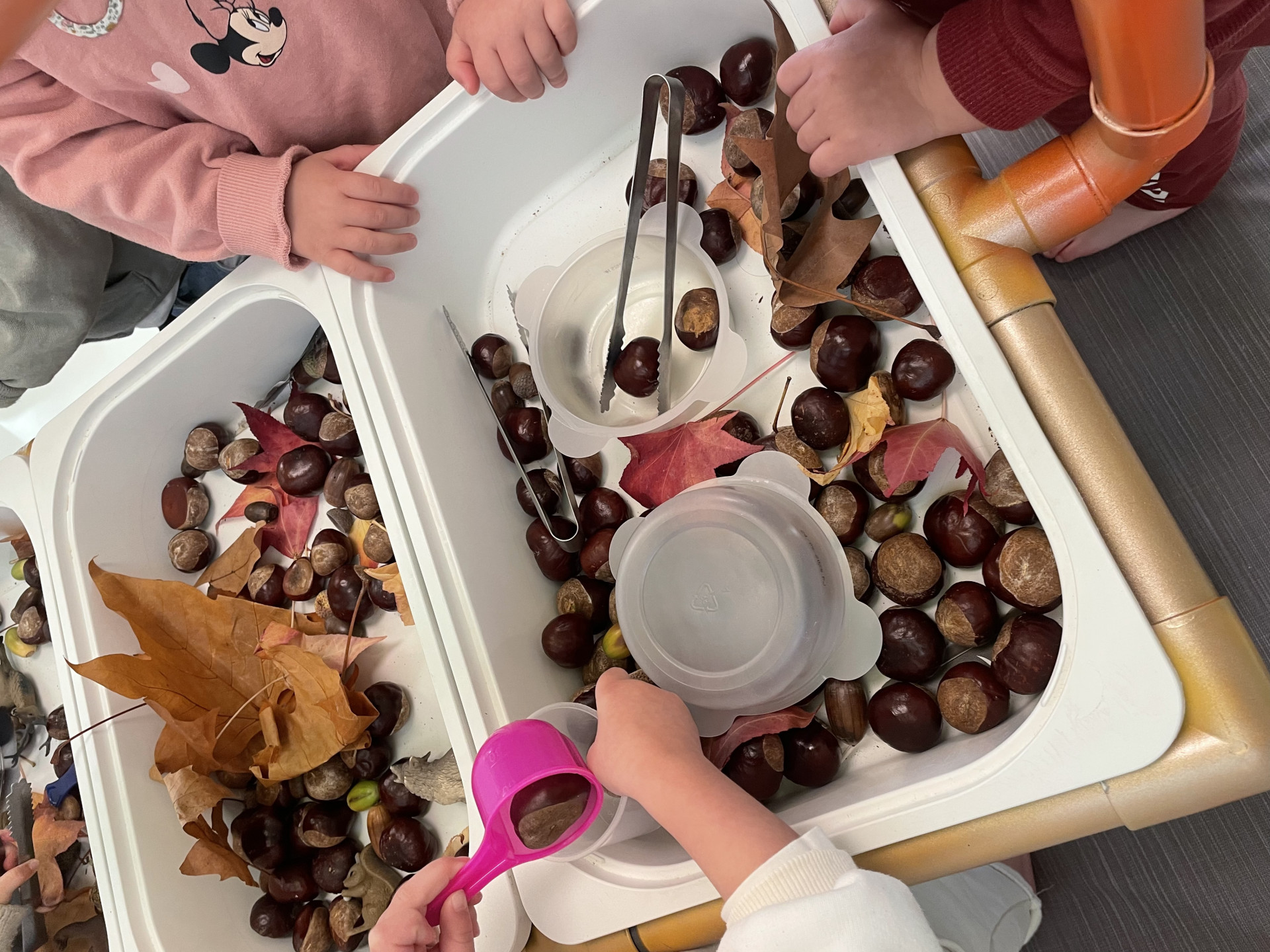 À la micro-crèche, l’automne s’invite dans nos jeux ! Les enfants découvrent avec plaisir les marrons brillants, les glands, les pommes de pin et les feuilles colorées. Ces petits trésors de la nature éveillent leur curiosité : on observe, on touche, on trie, on manipule… C’est l’occasion de stimuler les sens tout en s’amusant. L’automne devient ainsi un moment magique où la nature nous offre de belles matières à explorer et à partager ensemble.