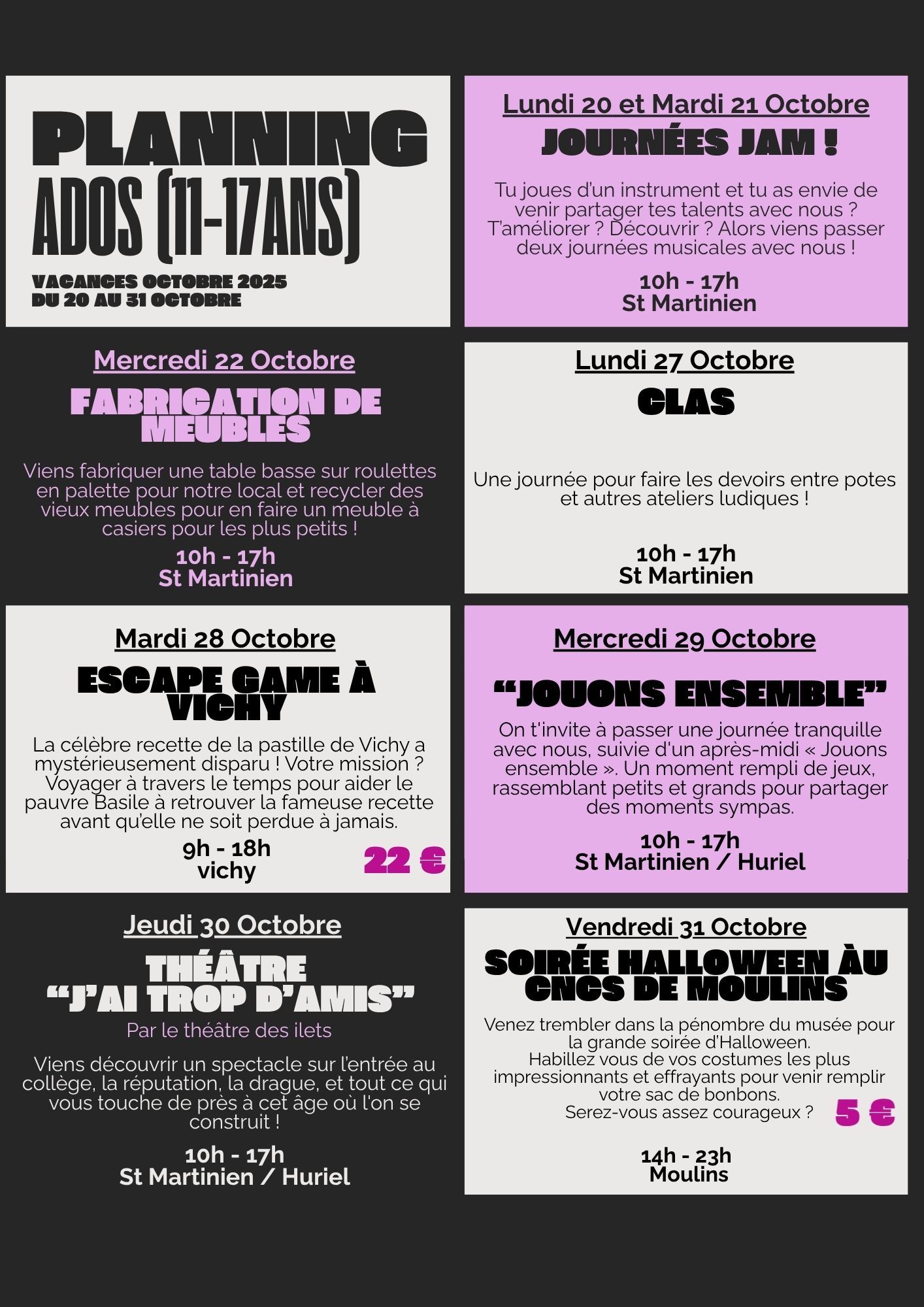 Voici le planning des activités pour les jeunes de 11 à 17 ans pendant les vacances d'octobre 2025.